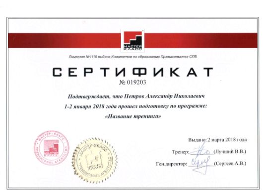Участники, которые наберут курс из любых 6 занятий, получат Сертификат Тренингового Агентства «Мастер-Класс» и Свидетельство о повышении квалификации установленного образца (Лицензия №1110 выдана Комитетом по образованию Правительства Санкт-Петербурга от 08.08.2014) (Стоимость получения Свидетельства – 1000 р.)
